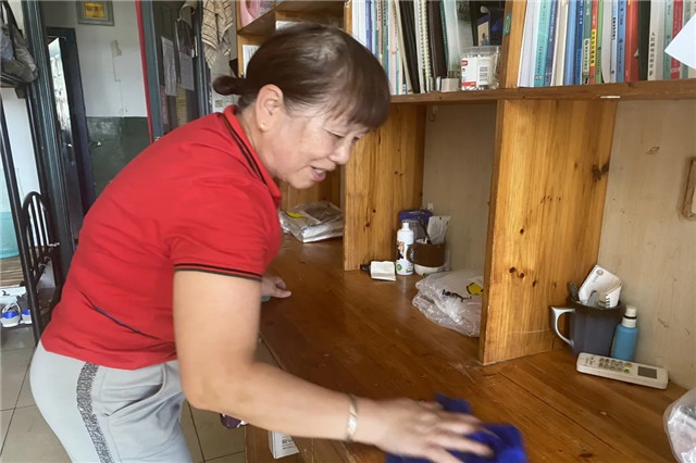 为进一步保障学生们身体健康,消除同学们的后顾之忧,营造良好学习生活环境,迎接后续入校的新生,8月20日,学工处组织宿管中心对2019级学生342间宿舍进行了整理打扫、开窗通风。宿管中心21名员工从早晨5点开始清扫行动,宿管阿姨们握着扫把,低身弯腰,将地板上的垃圾扫进畚斗,一间一间检查寝室环境卫生、开窗通风透气、细心整理归置物品、扫地清理垃圾。虽然南京的天气还是很炎热,但一想到能为学生带来舒适的居住环境,宿管阿姨们都干劲十足。清扫工作完成后宿管中心将对342间学生宿舍进行全封闭紫外线和84消毒处理,确保学生安全入住。