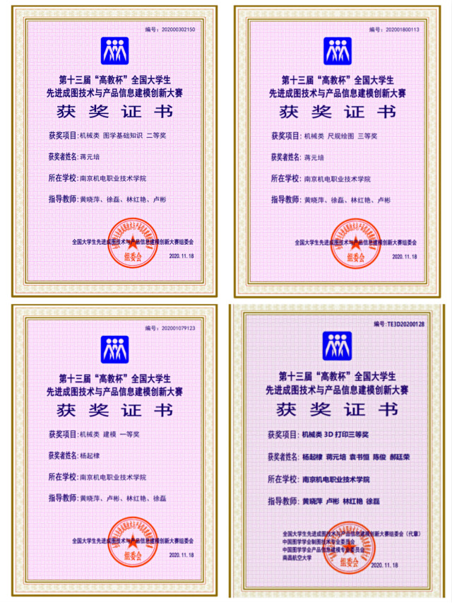 此次大赛我校机械工程系学生获得三维建模一等奖1项,基础知识二等奖1项,尺规绘图三等奖1项,以及3D打印三等奖1项的优异成绩。