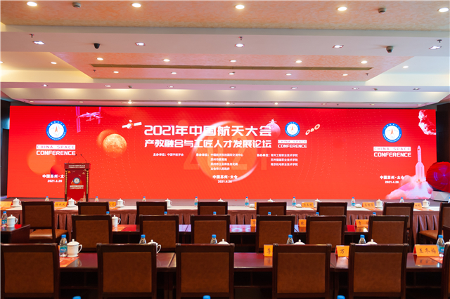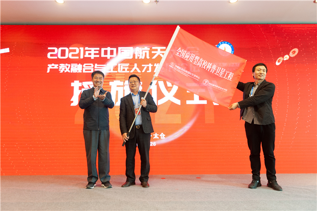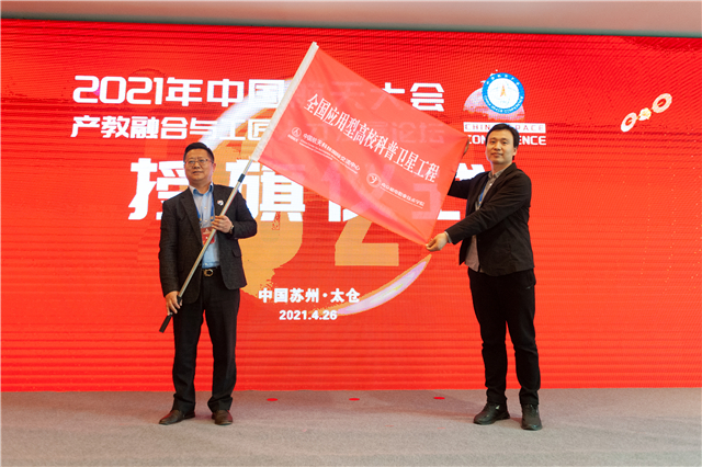 4月26日下午,2021年中国航天大会产教融合与工匠人才发展论坛正式开始。论坛先后举行全国应用型高校科普卫星工程启动及授旗仪式、“匠心之韵”我们的声音上太空活动启动仪式等环节。仪式上,在国家航天局系统工程司吕波司长、航天科技集团科技委郭玉明主任、太仓市许超震市长、大国工匠徐立平等四位领导的见证下,我校周庆礼书记与中国航天科技国际交流中心周岫彬主任共同启动了全国应用型高校科普卫星工程。随后,航天科技集团科技委郭玉明主任将全国应用型高校科普卫星工程的旗帜授予我校,我校周庆礼书记与蓝岛创客空间王国珍主任共同展开。冉冉的红旗标志着全国应用型高校科普卫星工程正式拉开帷幕。