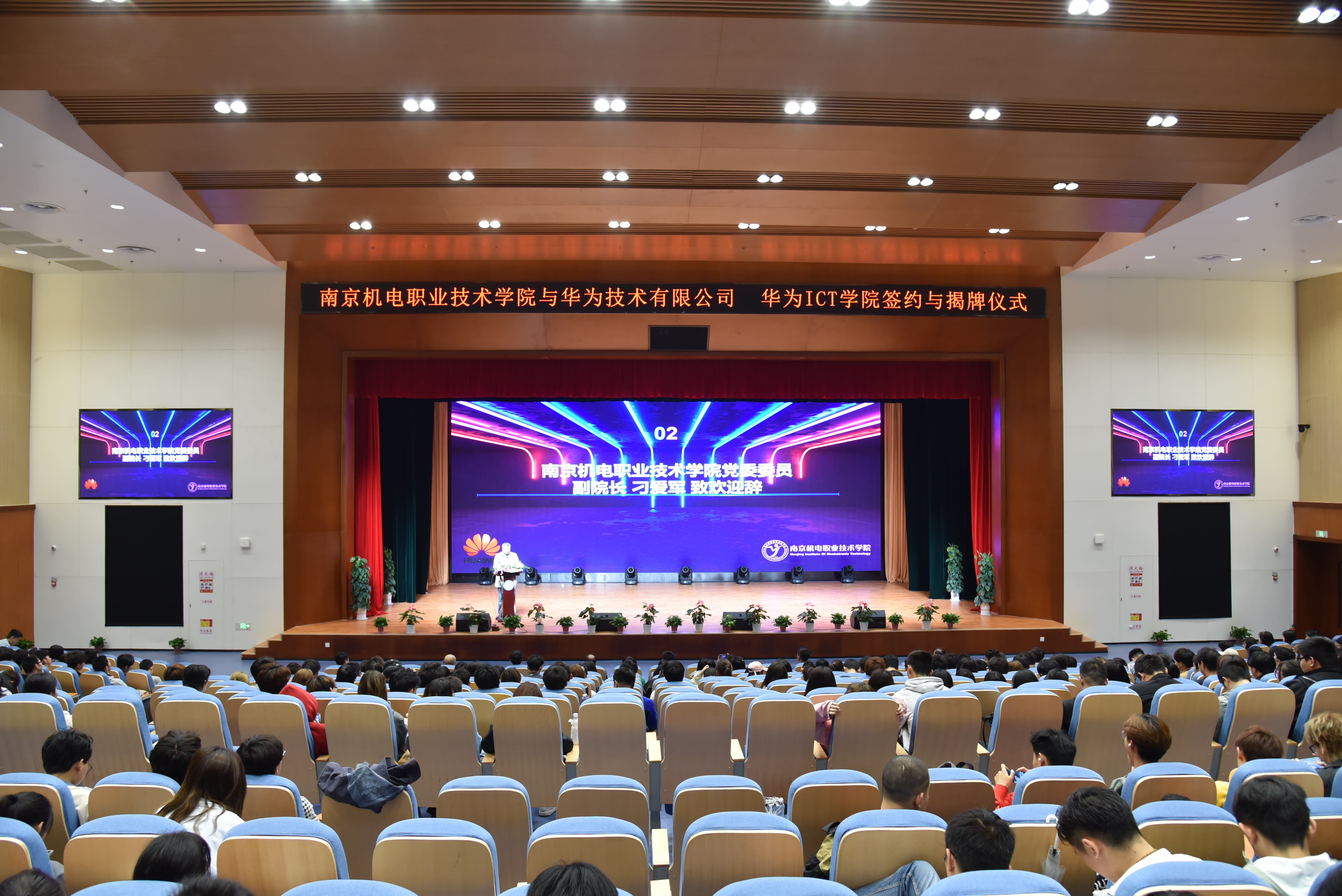 4月27日下午,南京机电职业技术学院华为 ICT 学院签约揭牌仪式在学院报告厅举行。高淳区教育局副局长吕明霞,南京市高等职业教育创新创业园副主任孙爱国,华为政企部副总经理晁文广、江苏万和系统工程有限公司董事长宋天兵出席揭牌仪式,华为江苏教育行业副总经理杨文彬,华为江苏人才生态总监杨鹏、学校党委委员、副院长刁爱军、信息工程系主任王玮出席签约仪式。信息工程系全体教职工、2020级全体学生近700余人参加仪式。仪式由校企合作处处长李木香主持。