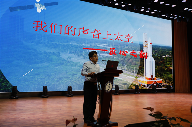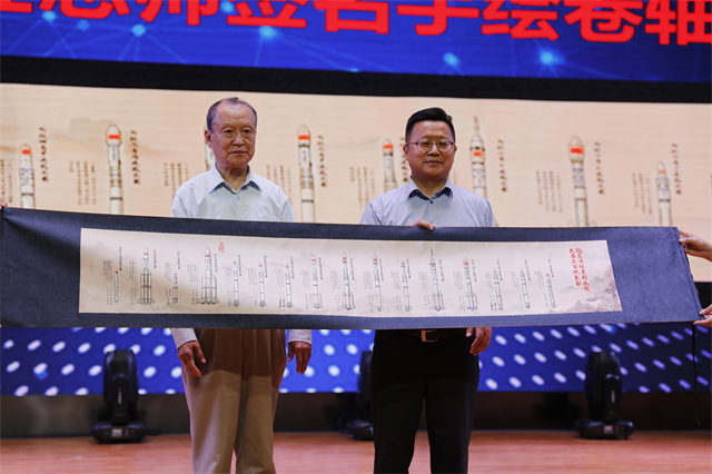 中国工程院院士贲德宣布“让南京职教师生的声音遨游太空”工程圆满成功,并给南京机电卫星载荷研制工程总指挥周庆礼授予太空好声音荣誉证书,赠送历任火箭总师签名的中国长征系列运载火箭手绘卷轴。贲德院士和周庆礼书记对职校学生发表了寄语。贲院士表示,希望各位同学认真学习,刻苦钻研,早日成为国家的栋梁之才。周书记祝愿南京职教的航天梦早日实现。全场观众报以热烈的掌声。