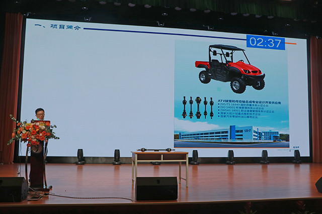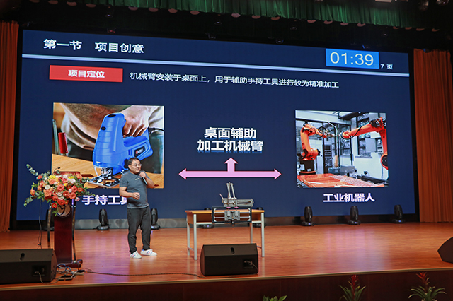 项目路演展示环节中,学校师生为观众带来了一批有创意、有内涵、有丰富想象力和创造力的作品。在创新制作组中,学校蓝岛创客空间黄克瑶老师的《桌面辅助加工机械臂》将直线导轨与关节转动结构相结合,辅助手持工具实现空间内XYZ三轴坐标移动,有效解决了手持焊接设备无法精确移动、加工精度较低的问题。南京冠盛公司的王忠军带来《高强度大转角等速驱动轴总成》项目,为全地形车自主研发了一款高强度,大摆角的驱动轴总成,使固定节最大转角超过50度,移动节最大转角超过40度,采用铬镍合金钢,大幅提升静扭和疲劳强度。