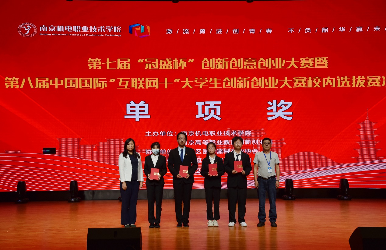 在颁奖仪式上,学校副院长刁爱军做总结发言。刁爱军带领观众回顾了整段赛程, “三创大赛”对学校人才培养,师生跨学科交流,综合能力提升等方面发挥着积极的推动作用。他希望学校师生在新时代创新创意创业浪潮中辟波斩浪、扬帆奋进,早日成为“创新达人”“创意精英”“创业大咖”。南京高职园主任汪春荣宣读了本届大赛现场决赛的评审结果。最终,《桌面级辅助机械臂》等5项作品获一等奖,《 “防患于未然”的无人机》《画化高淳话》等10项作品获二等奖,《 宿舍平移床上电脑桌》《文锦--校园文创》等15项作品获三等奖,《“凉山好汉”乡村支教梦”》等4项作品获单项奖。