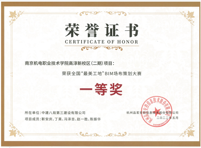 项目获得了全国最美工地BIM场布大赛一等奖,授权实用新型专利4个。目前正在申报“金陵杯”市级优质工程奖,创建江苏省绿色施工示范工程,江苏省标准化星级工地以及新技术应用示范项目,并计划申报“扬子杯”省级优质工程奖。