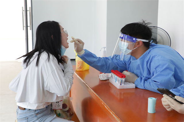 在疫情防控应急演练部分,设置了发现、报告、启动、处置环节,对学校XX为核酸检测异常人员的应急处置进行了全流程模拟演练。