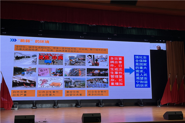 江苏超达应急技术研究院首席专家王建东教授带来“提升防灾减灾能力,共建安全和谐校园”讲座,王教授针对校园可能存在的安全问题进行剖析,介绍了如何做好校园安全和应急工作,提升学校的各种安全事件的预警联动和应急处置能力,提升校园风险应对和应急管控能力,提升学生、教职工安全应急意识和防灾减灾能力。