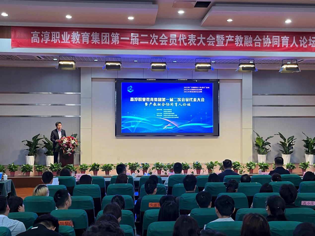 为进一步加强高淳职业教育集团组织建设,充分发挥职教集团职能作用,深入开展职业教育产教融合学术交流活动,繁荣职业教育理论,推进职业教育事业改革发展,更好地服务区域经济建设与产业发展,5月26日上午,来自市教育局、区政府、区教育局、学校、企业等领导齐聚江苏省高淳中等专业学校举行高淳职业教育集团(以下简称集团)第一届二次会员代表大会暨产教融合协同育人论坛。南京市教育局副局长潘东标,南京市教育局职社处处长黄子亮,高淳区委宣传部部长杨勇,高淳区教育局局长刘海军,高淳区委教育工委副书记芮平禄等市区领导出席会议,开云官方网页版等集团第一届理事单位领导以及南京冠盛汽配有限公司等新发展会员单位代表参加活动。现场300余人参加活动。