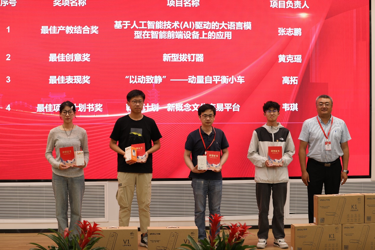 项目路演环节中,各位参赛选手挥洒创新激情、碰撞创意思维、践行创业梦想,为决赛现场观众带来了精彩的视听盛宴。我校电子工程系教师张志鹏带来项目《基于人工智能技术(AI)驱动的大语言模型在智能前端设备上的应用》,采用基于百度文心一言大模型的自然语言处理技术。通过对用户语音指令的识别和理解,并根据语义生成回答并在前端智能设备如网络摄像头(IPC)、智能音箱上执行相应操作,实现智能化交互。我校电子工程系学生殷栎涵的项目《基于人工智能-可视化巡检监控机器人》易操作、高精度、低成本,可以辅助操作人员快速、简便 的设置规划路径,提升检测效率,更好地适应中小化工企业及转运装卸区域的地域环境, 快速完成检测区域检测。我校创客导师黄克瑶带来项目《新型拔钉器》,利用圆管、螺杆、螺母、卡爪、轴承等零件组合成一个螺旋机构。将羊角锤拔钉子杠杆原理转换为螺旋上升的方式并可通过电动螺丝刀转换为电动工具,让铁钉也能”旋出来”。