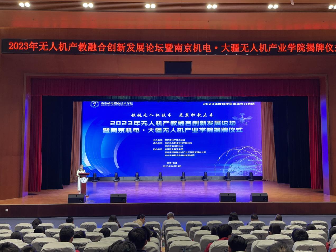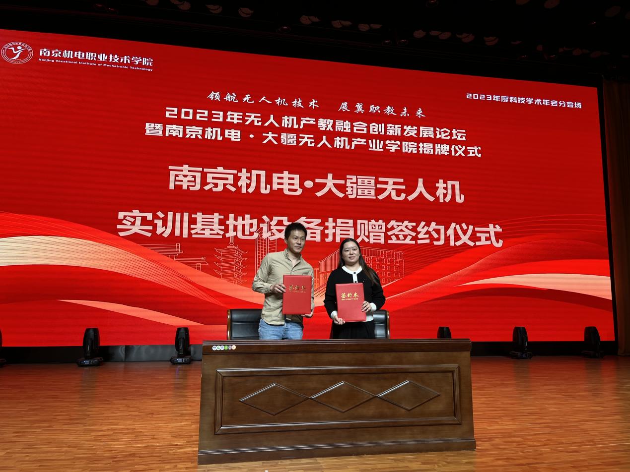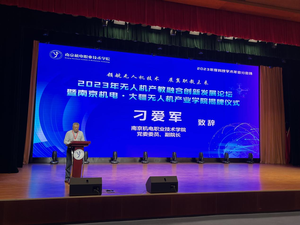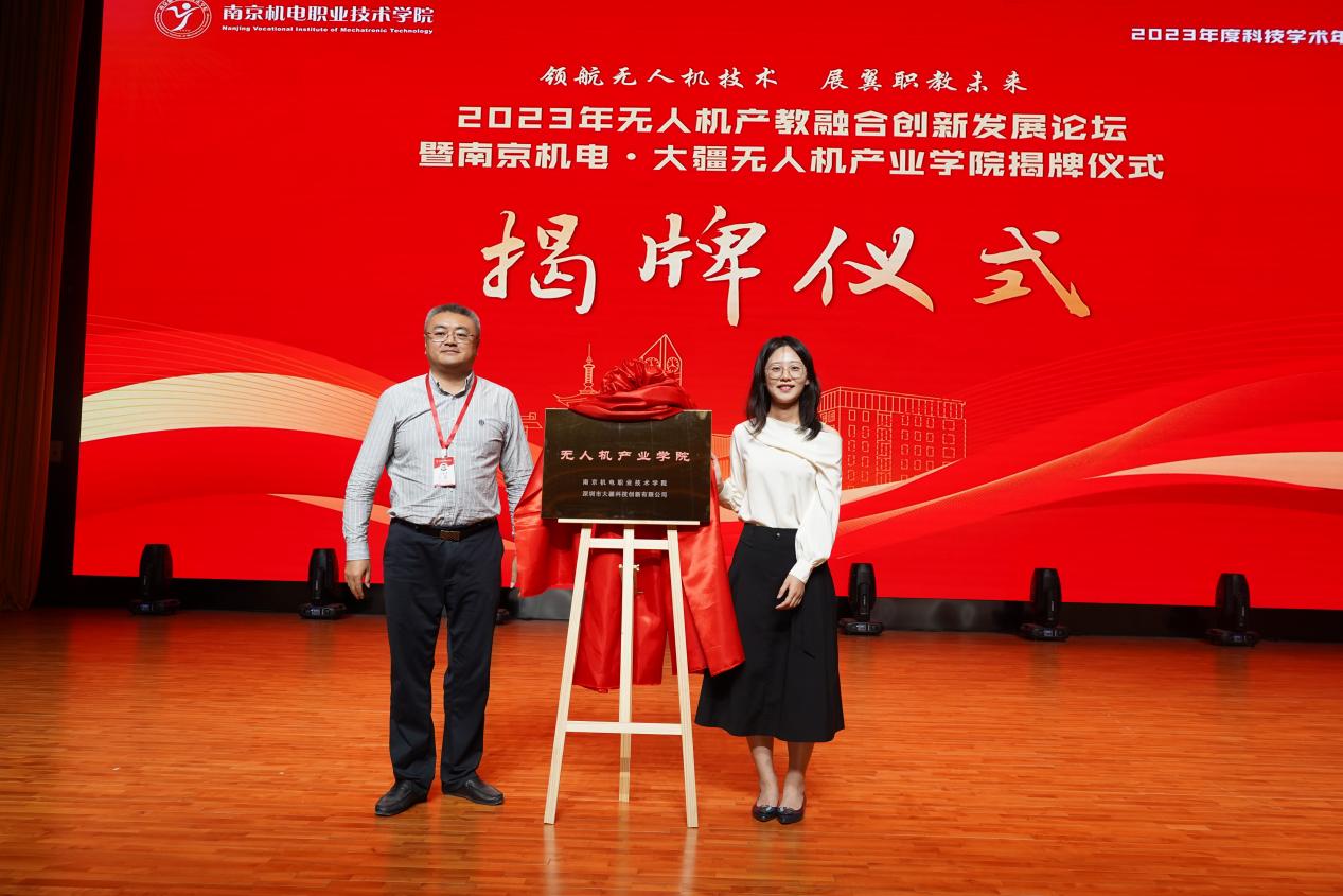 2023年10月24日下午,2023年度科技学术年会分会场——无人机产教融合创新发展论坛暨南京机电•大疆无人机产业学院揭牌仪式在学校青春剧场顺利举行。本次活动由南京市科学技术协会主办,由开云官方网页版科协、南京市高淳区科协承办,由高淳职业教育集团、南京高淳高新技术产业开发区管理办公室、南京高等职业教育创新创业园等共同协办。南京航空航天大学研究生院副院长郑祥明,南京航空航天大学飞行器设计专业工学博士、教授唐正飞,高淳区科学技术协会副主席杨腊斌,南京高等职业教育创新创业园党工委委员、副主任孙爱国,深圳市大疆创新科技有限公司华东区代表滕菲,南京弘谷信息科技有限公司总经理赵华君,南京弘谷信息科技有限公司副总经理顾启凌,学校党委委员、副校长刁爱军,党委委员、纪委书记、工会主席姜振宇等领导出席本次活动。本次活动由学校科研及校企合作处处长李木香主持,电子工程系全体教师及学生代表,高淳职业教育集团理事单位江苏省高淳中等专业学校和高淳第一中学的师生代表参加了本次活动。