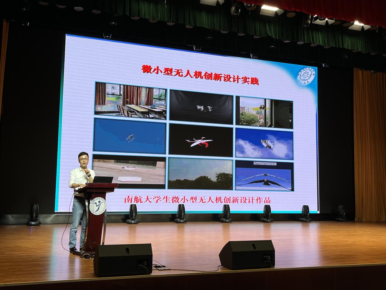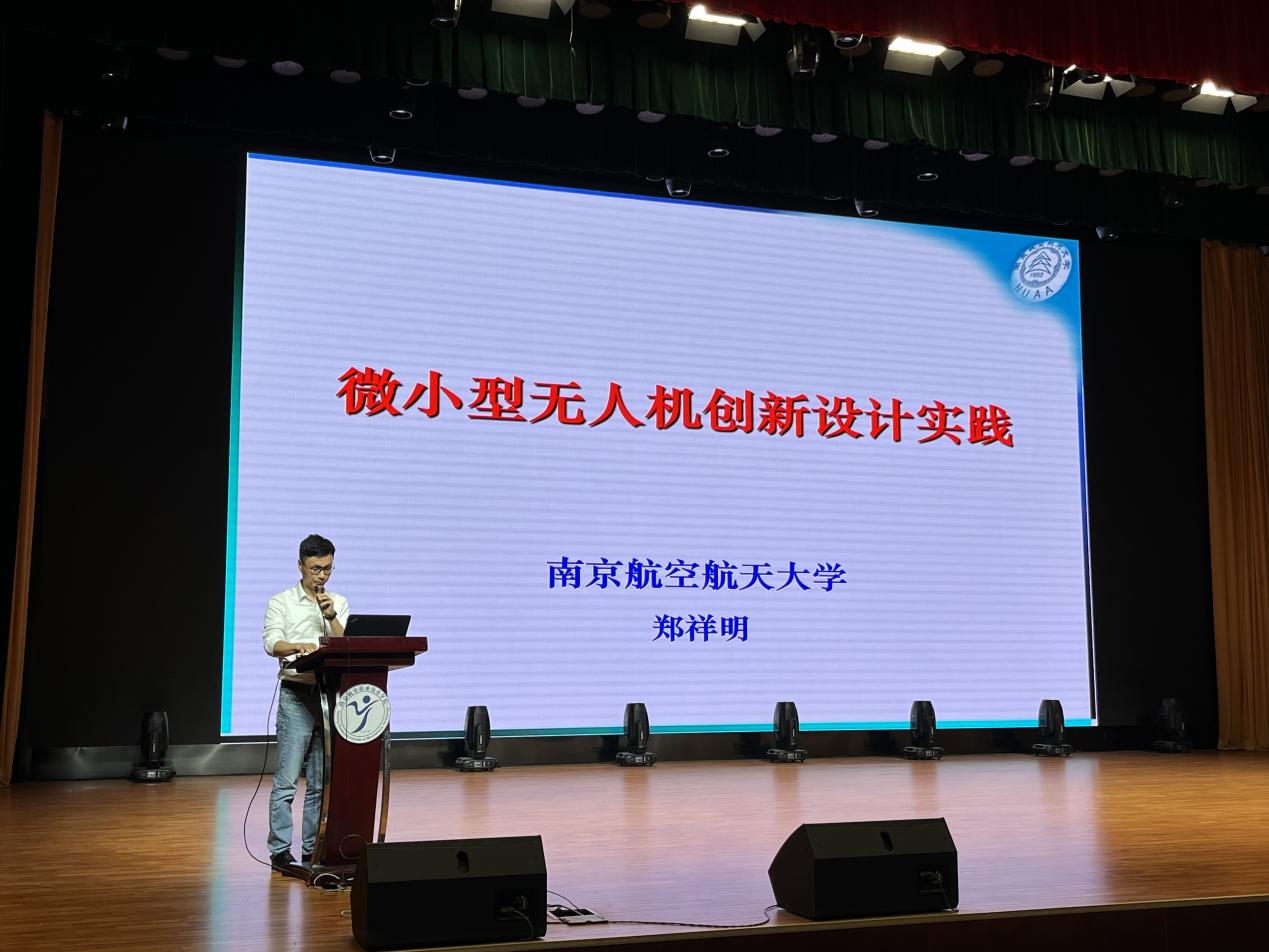 主旨报告中,南京航空航天大学研究生院副院长郑祥明带来报告《微小型无人机创新设计实践》,展示了师生合作共同完成的微小型无人机创新作品以及从想法到成果的完整过程。郑教授认为创新是对知识的更深层次挖掘,大学生要学会从学习生活中的点滴来发现创意、获得灵感,用务实的态度、科学的方法对待创意,并且在创新实践中不断学习新知识、掌握新能力。主题报告中,南京航空航天大学飞行器设计专业工学博士、教授唐正飞带来报告《飞向蓝天,逐梦太空》,为同学们普及了航空航天的基本概念、航天的基本原理、航天科技发展历程以及航天技术的应用等知识,激发了老师们和同学们开展航空航天及无人机专业学习与建设的热情。