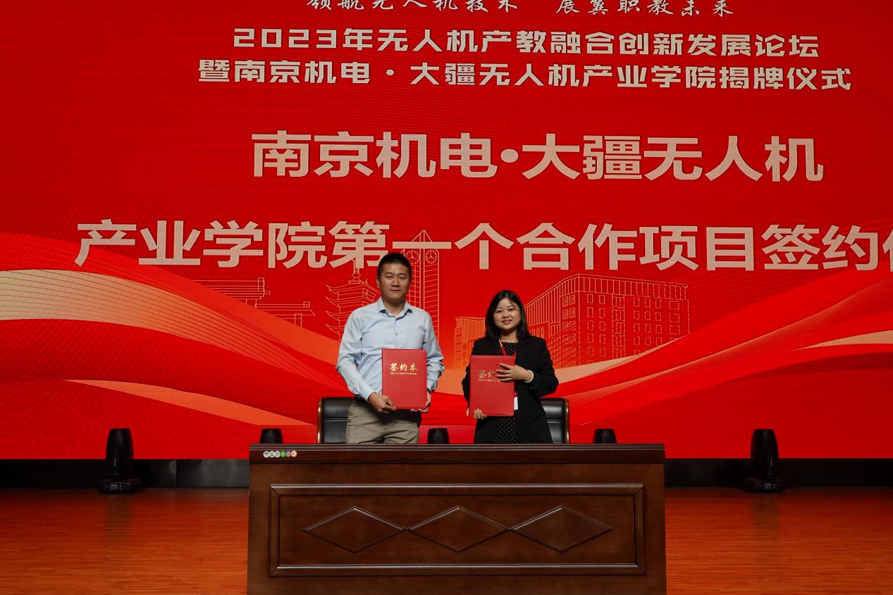 揭牌及签约仪式上,学校党委委员、副校长刁爱军与深圳市大疆创新科技有限公司华东区代表滕菲共同为“南京机电•大疆无人机产业学院”揭牌。学校电子工程系主任姚小冬与滕菲为“南京机电•大疆无人机实训基地”揭牌。学校党委委员、纪委书记、工会主席姜振宇与南京弘谷信息科技有限公司总经理赵华君共同签订“南京机电•大疆无人机实训基地设备捐赠协议”。学校电子工程系副主任丁向琴与南京弘谷信息科技有限公司副总经理顾启凌共同签订“南京机电•大疆无人机产业学院第一个合作项目协议”。学校与深圳市大疆创新科技有限公司将本着优势互补、共同发展的宗旨,坚持“育人为本、产业为要、产教融合、创新发展”的建设原则,以区域无人机产业行业发展急需为牵引,立足机电学院办学定位和发展思路,建立长期、紧密的合作关系,打造融专业人才培养、关键核心技术研究、前沿技术创新应用推广、专业师资赋能、辐射地方产业、企业孵化服务、学生创业辅导等功能于一体的无人机领域示范性人才培养实体。