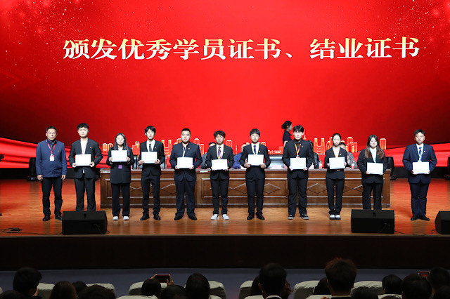 结业仪式上,党委工作部部长周启国宣读了《2023年第十五期学生干部培训班表彰决定》。授予校团委、校学生会和各系部共276名同学“优秀学员”荣誉称号,授予609名学生结业证书。希望受表彰的同学争先创优,不断奋发向上,开拓进取。随后,张宝中和各系部书记为学生干部代表颁发了优秀学员证书和结业证书。