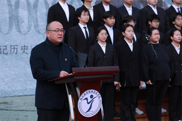 默哀闭,学生代表诵读《和平宣言》,饱含深情、铿锵有力地朗诵声响彻操场。学校党委书记、校长周庆礼作国旗下讲话,他表示,这个纪念日背后所携带的历史不仅是尊重与哀悼,更是反思与警示。国家公祭日是我们铭记历史、缅怀先烈的日子,也是我们警醒自身、珍视和平的日子。希望每一位师生都能保持警惕,珍惜和平,守护家国。和平不仅需要我们的珍惜,更需要我们的坚守。