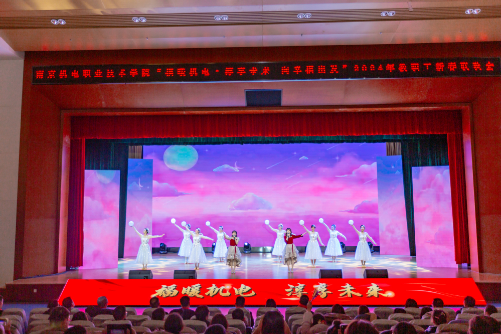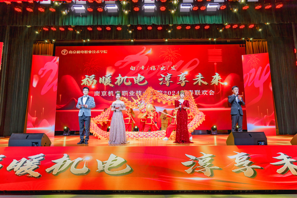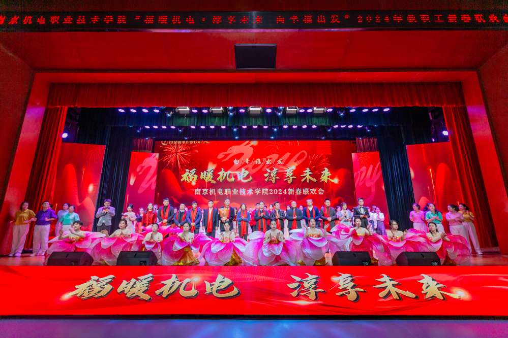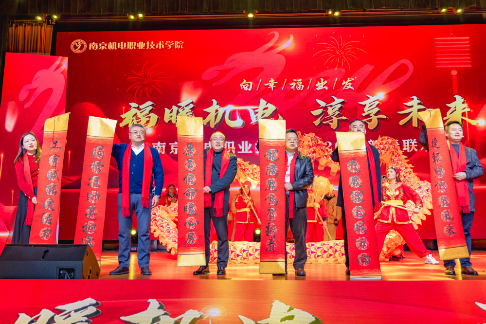 1月19日下午,青春剧场欢声笑语、载歌载舞,2024向幸福出发“福暖机电 淳享未来”新春联欢会成功举行。高淳区委常委、区政府常务副区长、党组副书记胡学艺,南京高等职业教育创新创业园管委会党工委书记刘宜军,南京高等职业教育创新创业园管委会党工委副书记、管委会主任孔桂红,中建八局三公司南京分公司党总支副书记、工会主席业绪敏,南京诚明建设咨询有限公司副总经理、总工程师王苏宁,新校区参建单位领导、学校党政领导与300余名教职工欢聚一堂,回顾2023年取得的丰硕成果,展望2024年即将开启的全新征程。