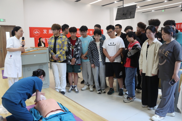 高淳区人民医院危重症学组娄玉娟护士长授课《人人学急救个个讲安全》。娄护士长现场向师生们演示了心肺复苏及海姆立克急救技术,并邀请两位学生上台实操演示,将讲座推向了高潮。
