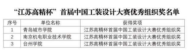 学校获得“江苏高精杯”首届中国工装设计大赛优秀组织奖。