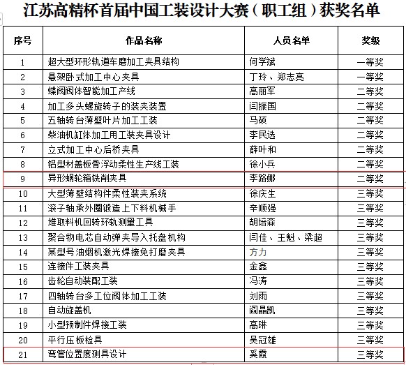 近日,由中国机电装备维修与改造技术协会主办,中机维工艺装备分会承办的“江苏高精杯”首届中国工装设计大赛历时三个月圆满结束。本次大赛行业企业和职业院校同台竞技,我校机械工程系师生组队共参赛10个项目,表现突出,成绩斐然,获奖率达100%。