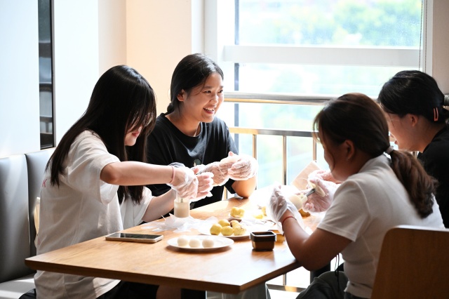 在月饼制作区域,同学们在专业烘焙师的指导下,亲手调配馅料、和面、塑形,忙得不亦乐乎。从经典的豆沙、莲蓉到创新的抹茶、巧克力,各种口味的月饼在大家的巧手下应运而生。制作过程中,同学们不仅学习到了月饼制作的传统技艺,还体会到了亲手制作美食的乐趣,更在合作中加深了同学间的情谊。
