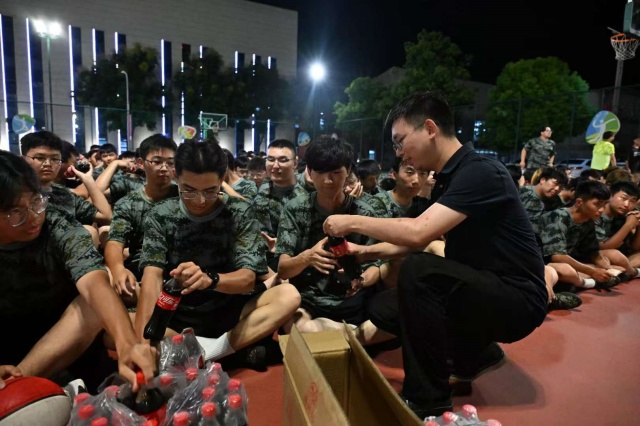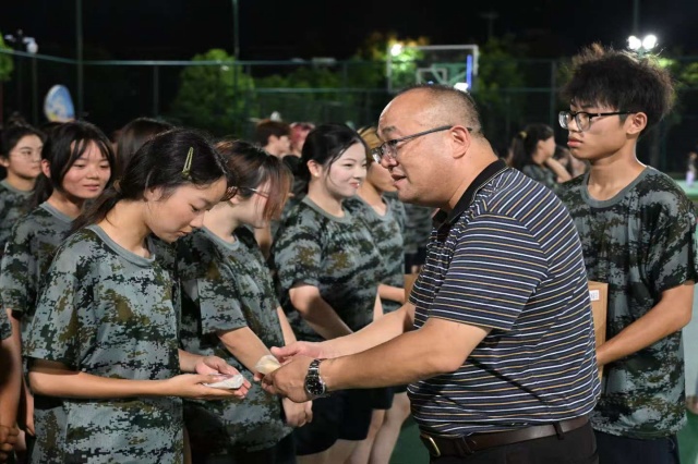 大联欢活动前,赵学洪和各系部党支部书记、新生辅导员老师来到田径场上,为同学们发放了精心制作的月饼。“虽然不能与家人共度中秋,但学校就是你们的家,老师就是你们的亲人。”赵书记不仅传递了节日的祝福,更给予了新生们对未来的鼓励和期待。他鼓励新生们珍惜大学时光,勇于挑战自我,在军训中磨砺意志,在学业上追求卓越。新生们手捧月饼,脸上露出幸福的笑容,纷纷表示这是他们度过的最有意义的一次中秋节。他们承诺将发扬知行合一、自强不息的校训精神,不断磨练自己,培养团队精神,为自己的大学生活留下难忘的时刻。