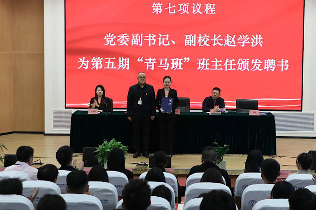 党委副书记、副校长赵学洪为第五期“青马班”授班旗,并为第五期“青马班”班主任魏澜颁发聘书。