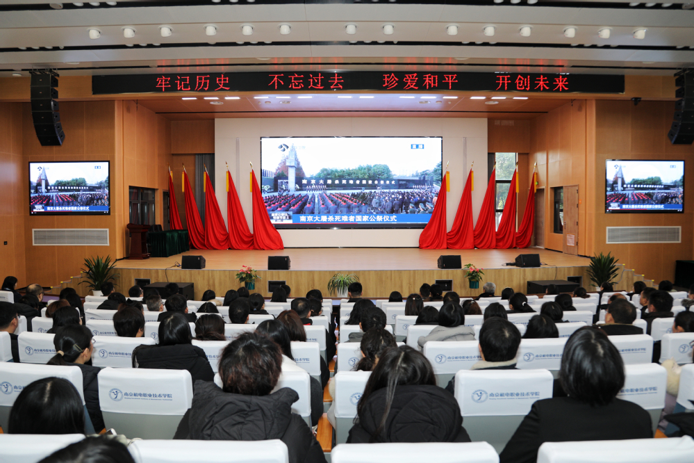 随着雄壮庄严的国歌声响起,师生们通过大屏幕观看国家公祭日直播,公祭仪式在南京大屠杀死难者纪念碑前庄严举行,各界代表和民众齐聚一堂,共同缅怀在70多年前那场浩劫中逝去的同胞。