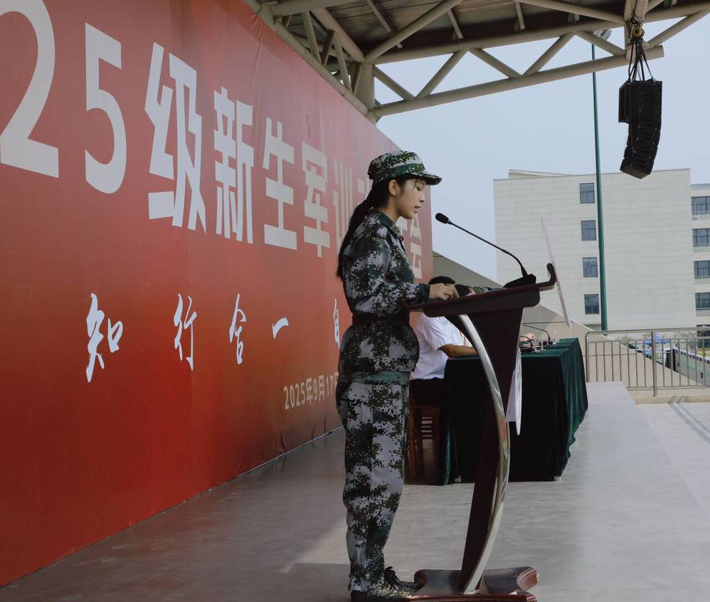 机械工程系工业设计252班胡欣妤同学作为新生代表发言,承诺将以饱满的热情投入训练,以优异的训练成果展现机电学子的风采。