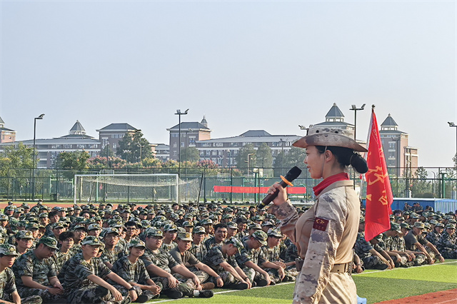 当天下午,阅兵精神主题报告会在学校操场率先举行,2025级全体新生及教师代表到场听。左星桥校友以“从天安门到母校:阅兵场上的坚持与蜕变”为题,深情回顾了从严格选拔到封闭集训,再到最终走过天安门接受检阅的全过程。她详细讲述了参阅民兵方队“优中选优”的严苛筛选标准,以及为达到“毫米级”动作精度所付出的艰辛努力。左星桥将个人感悟凝练为“坚持”“责任”“奉献”“集体”四个关键词,通过王二小、八女投江等英雄事迹的感悟,以及训练中教练员、保障人员默默奉献的生动事例,深刻阐释了阅兵精神的丰富内涵与时代价值。她鼓励学弟学妹们勇于突破自我设限,将个人成长融入国家发展,在正确的道路上坚持前行,其真挚的情感与昂扬的精神感染了现场每一位师生,掌声经久不息。