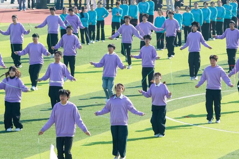 炫酷花样跳绳在翻飞的绳索中,同学们展示出令人惊叹的技巧与默契的团队配合。