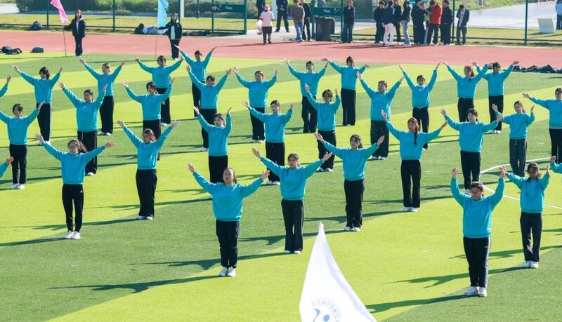整齐广播体操同学们精神饱满,动作标准有力,展现了日常体育教学的丰硕成果。