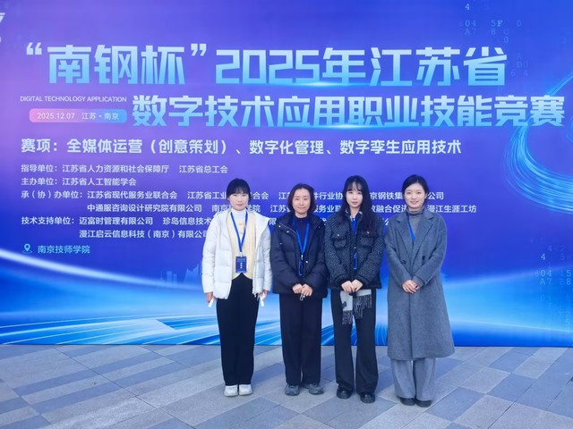 12月7日,2025 年江苏省“江苏工匠”岗位练兵职业技能竞赛全媒体运营(创意策划)赛项成功举办。学校信息工程系陈珑丹、施炜两位教师凭借扎实的专业功底和出色的实战能力,荣获职工组一等奖;学生李雨菡脱颖而出,斩获学生组一等奖,师生同台领奖,用亮眼成绩彰显了学校在数字技术应用人才培养领域的雄厚实力。