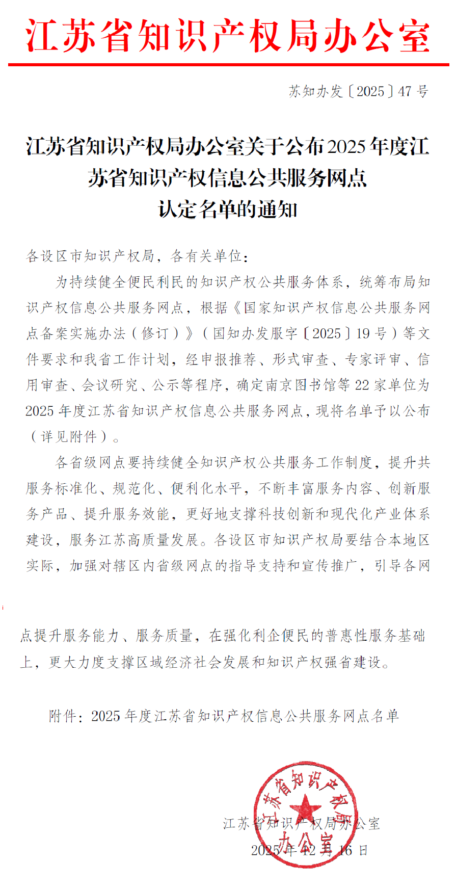 近日,江苏省知识产权局办公室印发《关于公布2025年度江苏省知识产权信息公共服务网点认定名单的通知》,我校成功获批2025年度江苏省知识产权信息公共服务网点,标志着我校知识产权公共服务能力获得省级权威认可。
