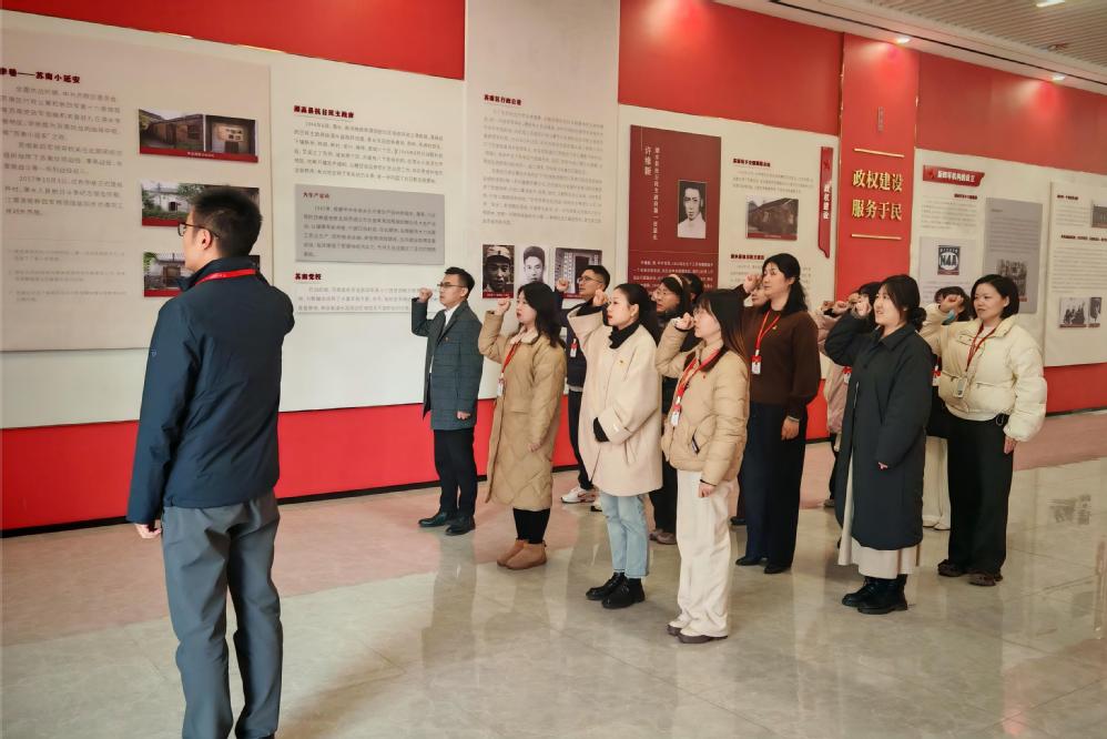 在庄严的党旗下,全体党员干部举起右拳,重温入党誓词。铿锵有力的誓言回荡在研学基地,既是对革命先烈的深切缅怀,也是对初心使命的再次宣誓,进一步坚定了大家听党话、跟党走的政治信念,强化了作为共产党员的责任担当与使命意识。