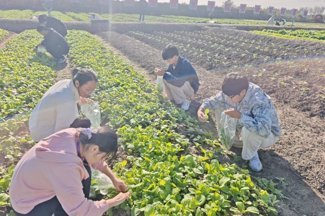 随着一声“开始采摘”,同学们迅速分组投入劳作。有的蹲在韭菜畦前,手握镰刀小心翼翼地切割;有的俯身挑选饱满的青菜,轻轻拔除后抖落根部泥土;还有的专注地梳理香葱,将鲜嫩植株整齐捆扎。一小时里,竹篮渐渐盛满带着晨露的收获,田间回荡着互助协作的笑声。
