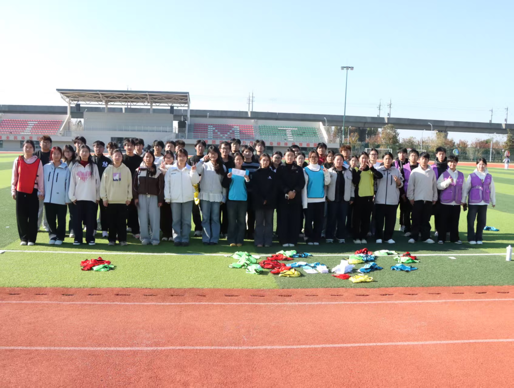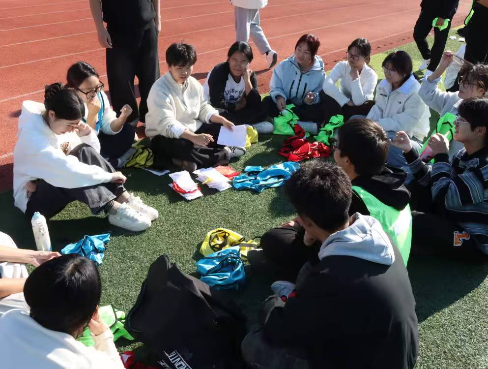 活动伊始,同学们身着不同颜色的分队背心,在绿茵场上集结合影——鲜亮的色彩衬着青春的笑脸,成为秋日校园里一抹生动的风景。合影过后,趣味互动环节随即开启:大家围坐成圈,或交流战术、或分享日常,轻松的氛围让彼此的距离悄然拉近。