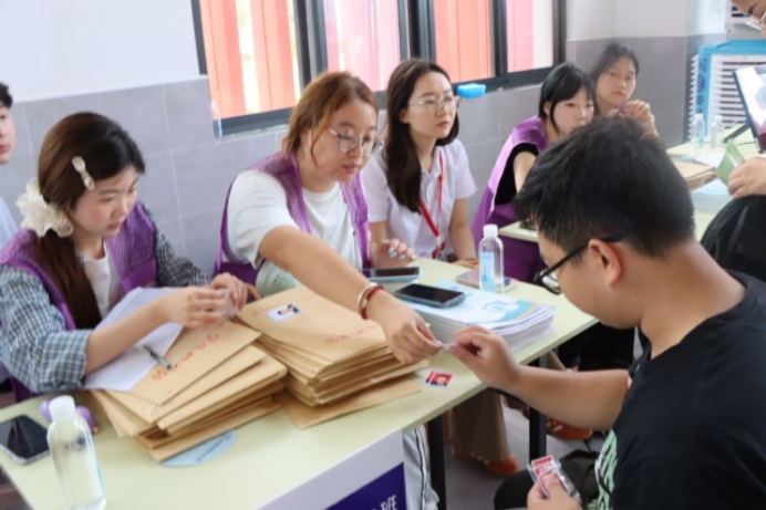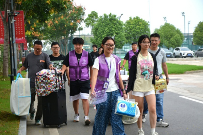 清晨七点半,电子工程系的师生志愿者们早已就位,迎接首批新生。校园内随处可见紫马甲忙碌的身影,他们热情引导新生办理入住、完成资格审核、班级报到等手续,耐心解答疑问,帮助运送行李,让初入校园的新生和家长倍感温暖。
