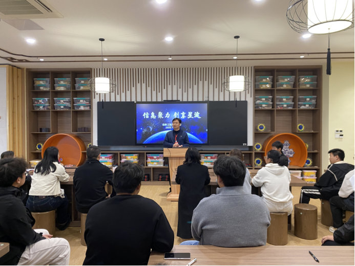 郑旻璐简要介绍了创客周期间的重点活动安排,专利申请实务培训、创新项目小组辅导等内容,并鼓励同学们积极参与、大胆探索,在活动中展现信息工程系学子的创新风采。专利公司指导老师代表也上台发言,承诺将为同学们提供专业的知识产权指导,助力创新成果得到有效保护与转化。