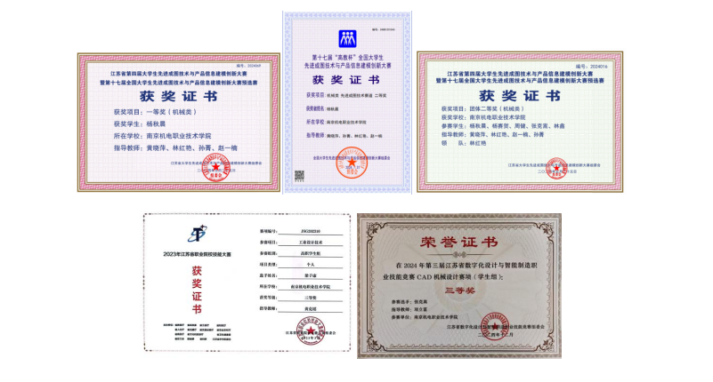 经过多年探索与实践,《机械设计基础》课程思政育人成效显著,赢得了同行和学生的高度认可。在课程思政的引领下,学生将所学机械知识转化为实践能力,将工匠精神与爱国情怀融入竞赛创新,近三年学生积极参加大学生先进成图技术与产品信息建模创新大赛省赛、国赛,获得一等奖2项、二等奖8项、三等奖11项;参加江苏省职业院校技能大赛,获得数字化设计与制造赛项三等奖3项;江苏省数字化设计与制造职业技能竞赛获CAD机械设计赛项三等奖1项。