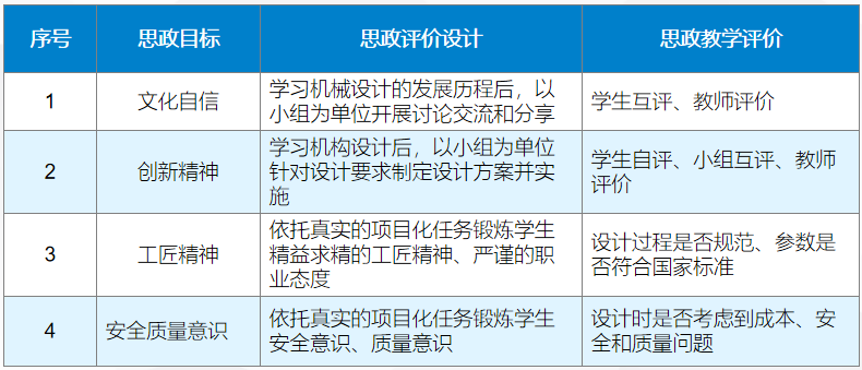 立足课程特色与学生认知规律,以“育人为本”为核心修订课程标准,精选机械领域典型案例,丰富课程思政案例库,实现思政元素与专业知识的精准耦合。同时革新考核评价体系,在原有教学考核基础上增设思政表现评分维度,构建“过程性评价与结果性评价结合、知识考核与思政素养并重”的综合评分机制,切实落实立德树人根本任务,全面提升机械设计与制造专业人才培养质量。