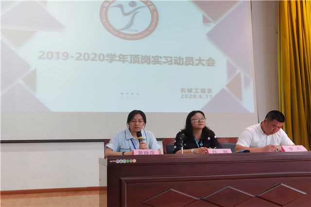 为进一步做好我系2018级学生顶岗实习工作,引导学生提前做好顶岗实习工作的相关准备,2020年6月11日机械工程系在学院报告厅组织召开了上下午两场2018级学生顶岗实习动员大会。本次大会由机械工程系学生干事孙晓燕主持,机械工程系主任佟静、党支部副书记李杰、副主任黄晓萍、18级各班辅导员以及2018级全体学生出席了此次大会。