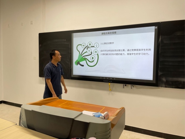 然后,工业设计专业周涛老师作为本次教研活动的分享人进行了主题分享,他介绍了创客教育背景及内涵,分析了《计算机应用基础》存在的问题。并对课程改革提出了自己的见解。第一,建设移动学习资源,搭建移动学习平台,促进学生自主学习、个性学习、终身学习;第二,发挥学生的主体作用,引入翻转课堂,教师根据学生需求讲解相关课程,启发学生思考并让学生通过网络搜寻资料并解决相关问题;第三,以赛促进教学,组织学生参加各类创客比赛,通过竞赛提高学生利用计算机解决实际问题的能力,增强学生的学习动力;第四,课程的重构,可以开设选修课程,让学生根据自身的专业和兴趣爱好选择课程。