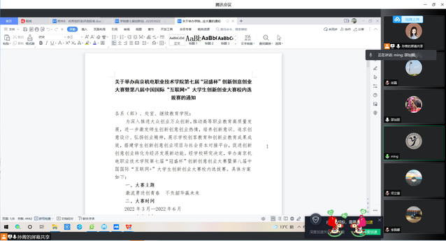 为深入推进大众创业万众创新,推动高等职业教育高质量发展,进一步激发师生创新创意创业热情,培养创新意识、追求创意设计、弘扬创业精神,展示学校创客教育和创新业教育成果成效,搭建学生创新创意创业项目与社会资本对接平台,促进创新创意创业转化为经济发展新动能,学校决定举办开云官方网页版第七届“冠盛杯”创新创意创业大赛暨第八届中国国际“互联网+”大学生创新创业大赛校内选拔赛。 2022年4月2日上午,机械设计与制造教研室全体老师在腾讯会议线上平台对校内选拔赛具体内容进行学习,会议由教研室负责人孙菁主持。