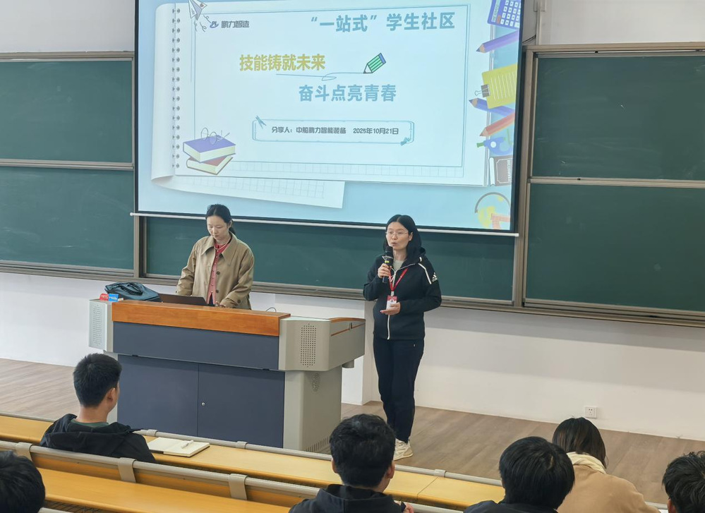 随后,檀仔维经理以中船鹏力科技有限公司为具体案例,深入浅出地剖析了现代企业对人才的能力要求。她围绕“职业能力提升”与“职场发展路径”两大核心主题,为同学们系统地梳理了从校园到职场的过渡阶段需要做的准备。檀经理指出,扎实的专业知识、卓越的实践能力、良好的团队协作精神和持续的自主学习能力,是未来在智能制造领域脱颖而出的关键要素。她的分享既有理论高度,又紧密结合行业实际,为同学们勾勒出了一幅清晰的职业成长蓝图。