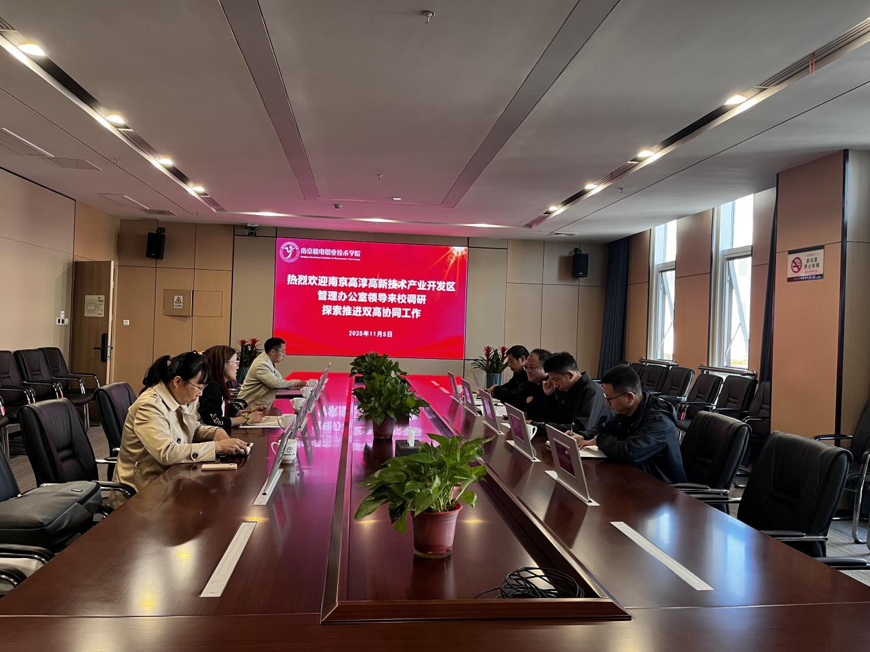 2025年11月5日,南京高淳高新技术产业开发区管理办公室主任孔振宇一行到访我校,开展探索推进双高协同工作的调研交流。学校党委委员、副校长刁爱军,科研及校企合作处处长李木香及专业负责人代表参加了本次交流活动。此次交流活动为双方后续深化合作奠定了坚实基础。