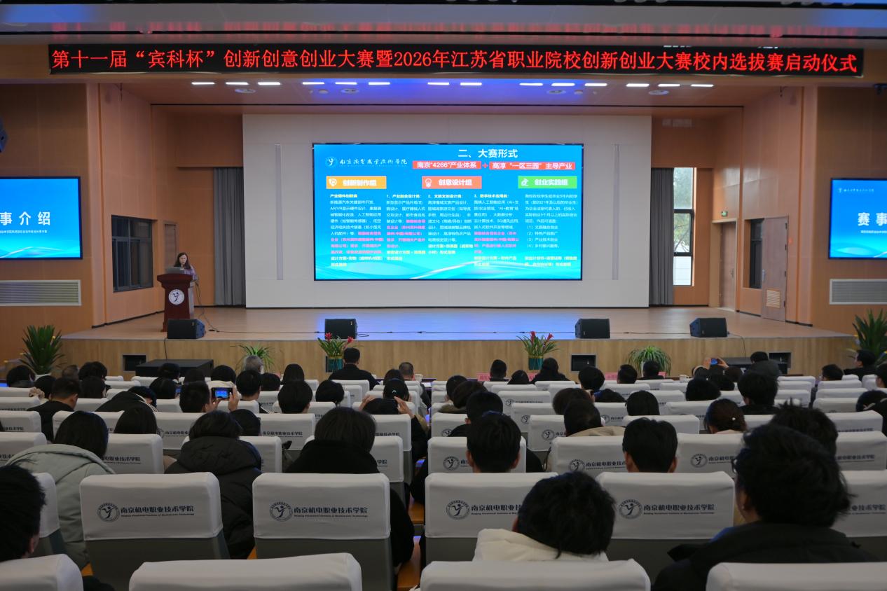 2025年12月30日下午,学校第十一届“宾科杯”创新创意创业大赛暨2026年江苏省职业院校创新创业大赛校内选拔赛启动仪式在乐学楼101举行。南京高等职业教育创新创业园管委会副主任汪春荣,南京市高淳区科学技术协会副主席孙爱国,南京高淳高新技术产业开发区管理办公室副主任吕鹏飞,扬州工业职业技术学院创新创业学院院长颜正英,宾科精密部件(中国)有限公司厂长程伶俐,学校党委书记、校长周庆礼,党委委员、副校长刁爱军,科研及校企合作处处长李木香、各部门负责人等领导出席启动仪式。合作单位代表及师生代表共500余人参加活动。