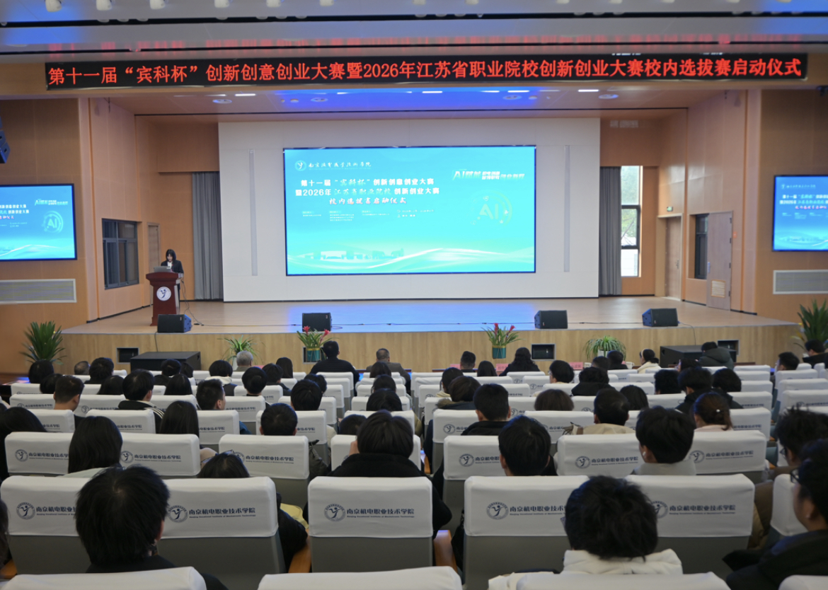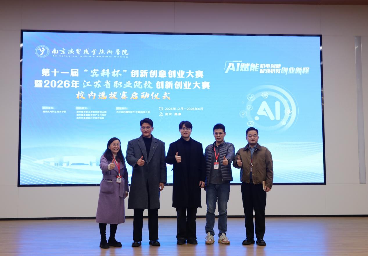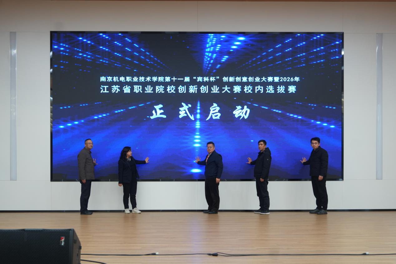 启动仪式上,汪春荣、孙爱国、吕鹏飞、程伶俐、周庆礼共同按下启动按钮,第十一届“宾科杯”创新创意创业大赛暨2026年江苏省职业院校创新创业大赛校内选拔赛正式启动。
