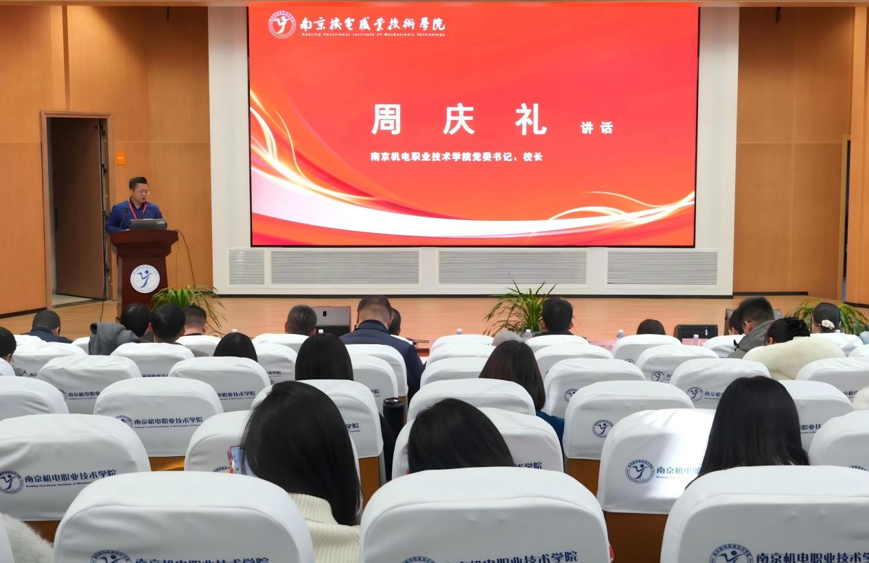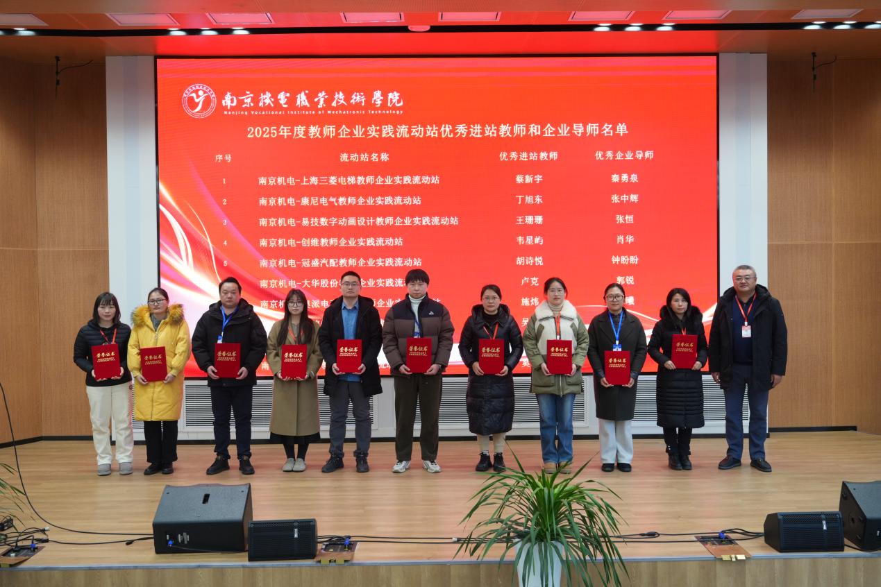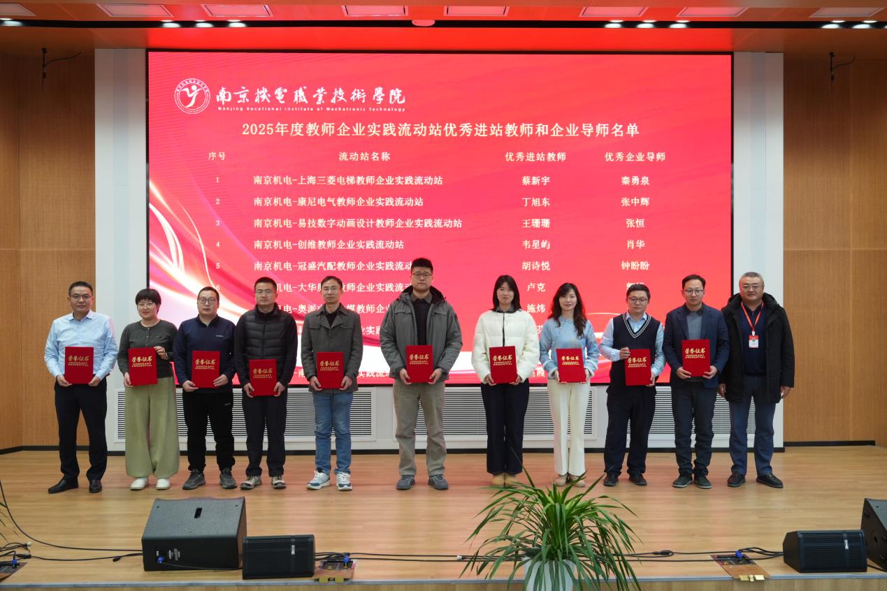 表彰仪式中,科研及校企合作处处长李木香宣读了2025年校级示范性教师企业实践流动站及优秀个人评选决定。南京机电-南钢教师企业实践流动站等4个流动站被授予“校级示范性教师企业实践流动站”称号,周庆礼为校级示范性教师企业实践流动站颁发奖牌。丁旭东等10位教师获评“优秀进站教师”称号,张恒等10位企业导师获评“优秀企业导师”称号,刁爱军为他们颁发荣誉证书。