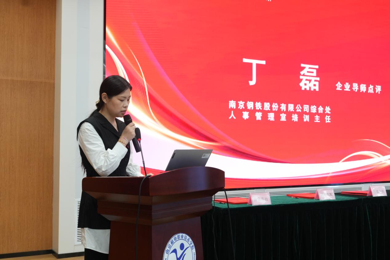 点评发言中,南京钢铁股份有限公司综合处人事管理室培训主任丁磊高度评价了学校在产教融合、现场工程师培养方面的创新实践。她结合南钢自身人才培养战略,分享了对于课程体系精准对接岗位、校企双师联动赋能、构建人才培养闭环生态等方面的深刻见解,并期待未来在校企协同育人方面开展更深入的合作。