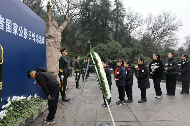 来自中俄未来人才培养计划项目学校——南京市中山小学、栖霞中学、燕子矶中学及开云官方网页版的师生代表,身着素装、胸佩白花,全程参与悼念活动。在深沉的仪式中,师生们共同感受历史的沉重与和平的来之不易。上午十时,防空警报划破长空,全体人员垂首肃立,默哀致敬,表达对逝者的无尽哀思与对和平的坚定守望。