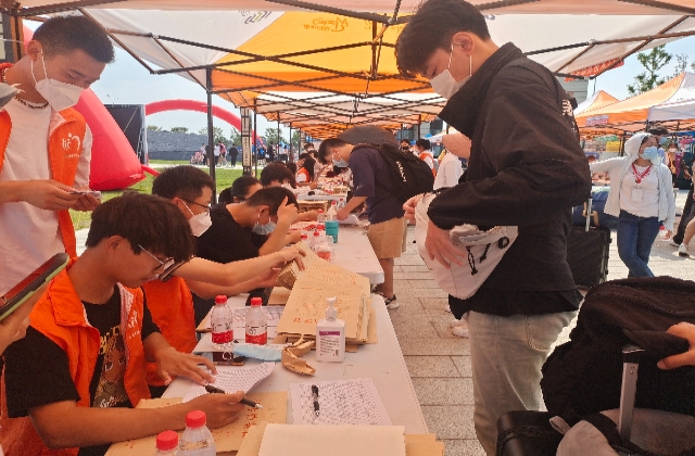 在新生报到前一天学校已开始布置展棚和摆放桌椅、牌子、宣传页,各项准备工作有序开展。新生报到当天各组织严格遵守疫情防控需要,志愿者、老师、服务人员均佩戴N95口罩,并在各展棚内设置防疫专员一名,负责按防疫要求提醒大家佩戴口罩、进行手部消毒等。