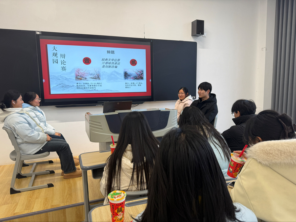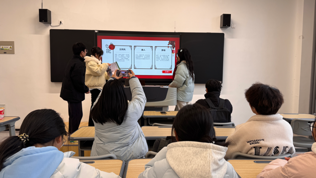 “人物对对碰”与“大观园辩论赛”接续升温。前者需限时用英语描述角色特征完成配对,大家对照参考词汇快速组织语言,在互动中深化人物认知;后者围绕辩题,同学们依托词汇支持用英语阐述观点,攻防间尽显思辨力。活动以“玩中学”打破传统模式,让大家在趣味互动中扎实提升英语应用能力,实现了娱乐与学习的双赢。
